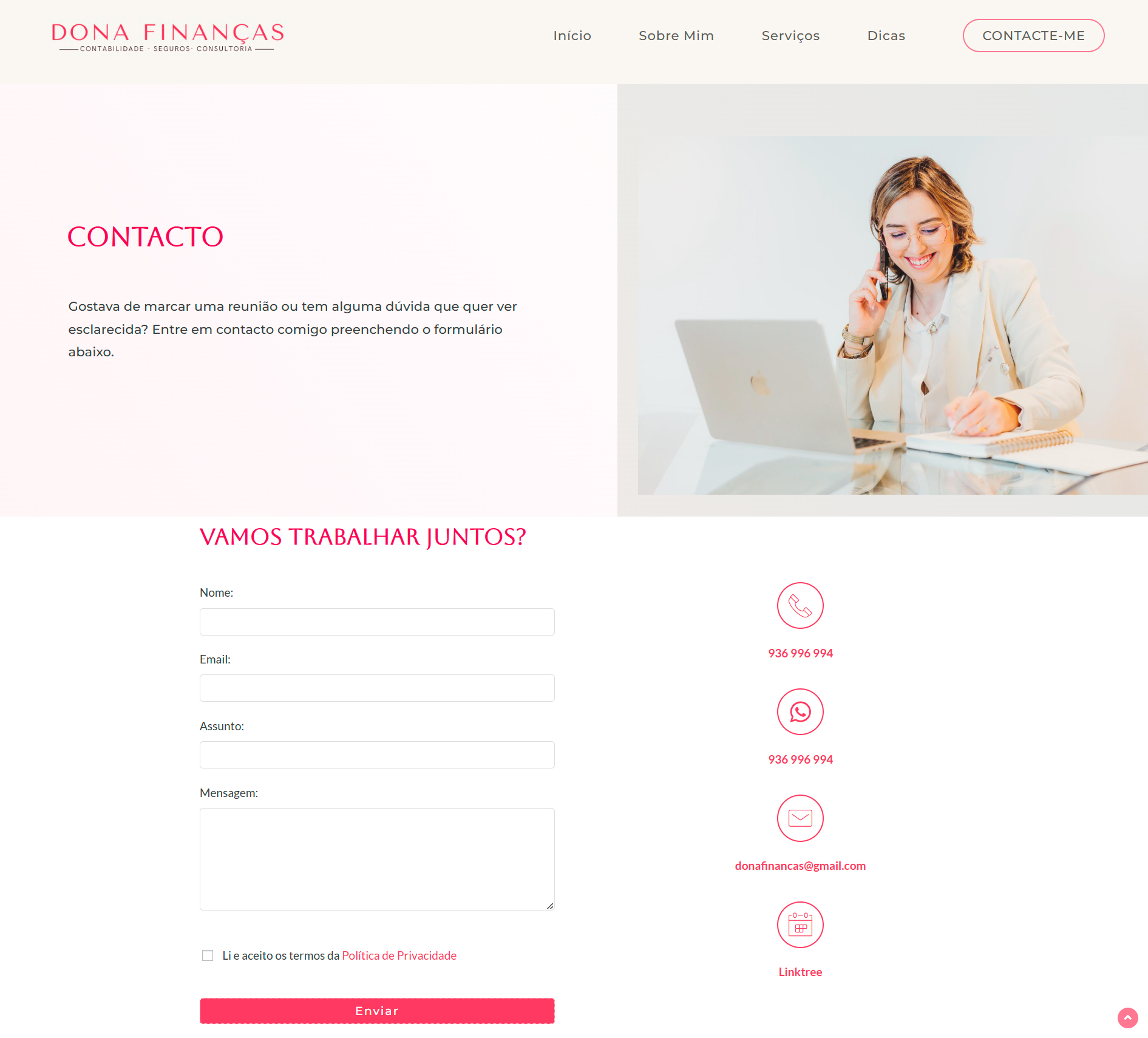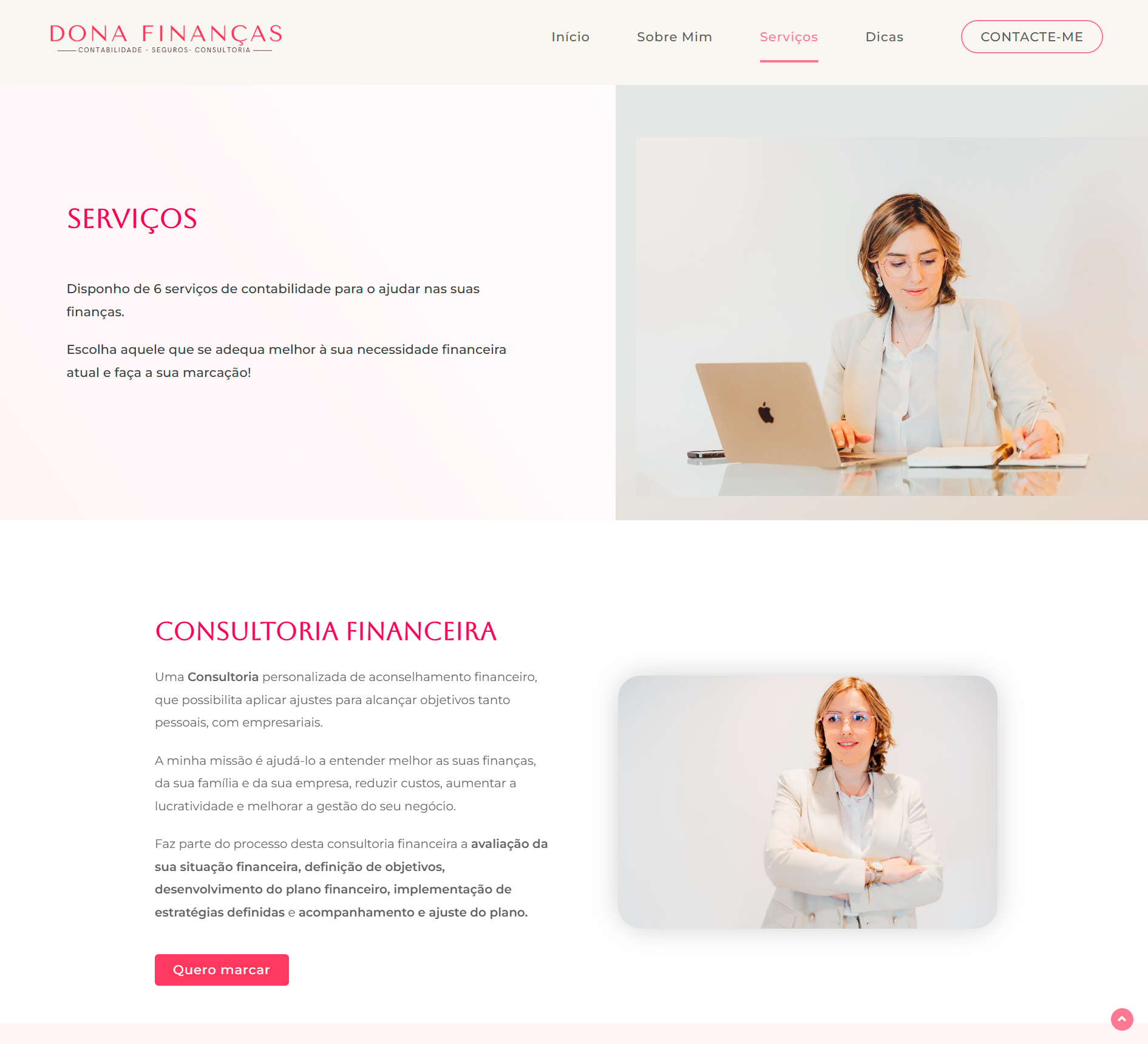 A "Dona Finanças" começou logo a investir nas redes sociais para conseguir alcançar um maior número de clientes. O site veio complementar o trabalho que já estava a ser feito pela sua equipa, com o propósito de otimizar os motores de busca (SEO) para aparecer nos primeiros resultados quando forem pesquisados "Contabilistas em Barcelos". A Daniela tem 6 serviços disponíveis e pretende ajudar as pessoas a controlarem melhor as suas finanças!