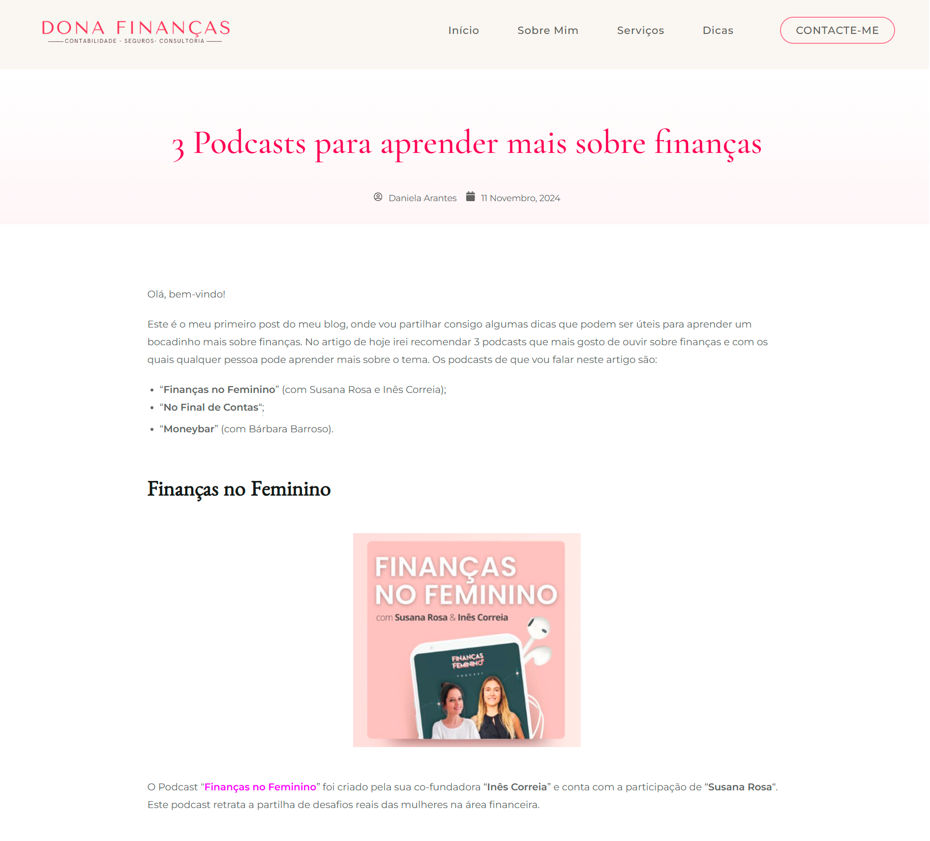 O site "Dona Finanças" contém 3 páginas importantes, mais uma secção de blog, que denominei de "Dicas",
